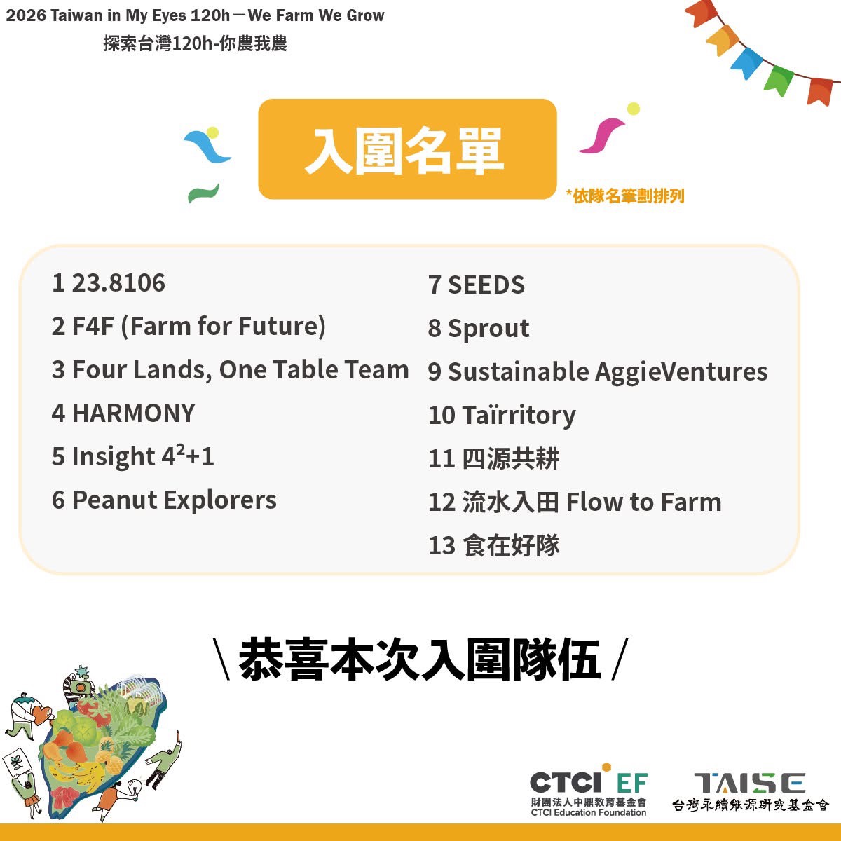 本屆活動報名踴躍,共吸引來自39個國家、28所大專院校的58支隊伍參與,展現青年世代對安全食農、糧食韌性及永續議題的高度重視。經評審團多輪審慎評選後,主辦單位除原訂12支入圍隊伍外,特別增額錄取1支隊伍,最終選出來自10所學校、19個國家的13支優秀團隊入圍。