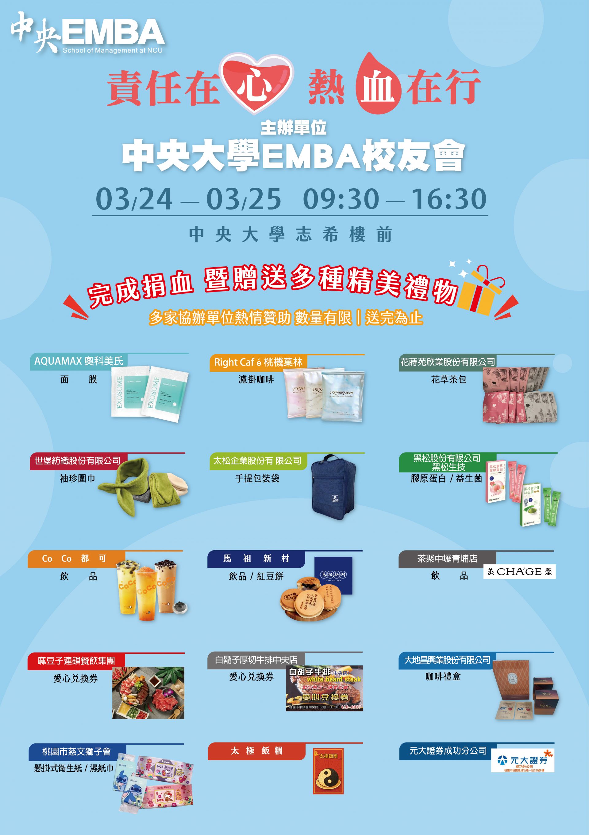 ■ 協辦單位:中大管理學院、奧科美氏、桃機菓林、花蒔苑欣業、世堡紡織、太松企業、黑松、Co Co可都、馬祖新村、茶聚中壢青埔店、麻豆子連鎖餐飲集團、白鬍子厚切牛排中央店、大地昌興業、桃園市慈文獅子會、太極飯糰、元大證券成功分公司